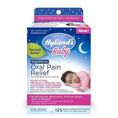 Hyland's baby nighttime oral pain relief tablets are very soft and will dissolve instantly in the mouth. Hyland's baby nighttime soothing natural oral discomfort/pain relief tablets with chamomilla, irritability & swelling, basic, 125 count 4.7 out of 5 stars 19,261 8 offers from $6.98 Product description discomfort doesnt stop when t
